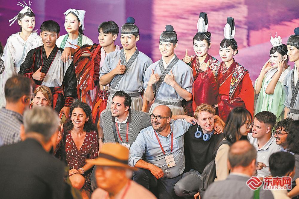 18日,舞台剧《月映武夷》演出结束后,与会嘉宾与演员们合影。福建日报记者 王毅 摄