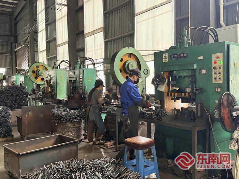 福建永德利实业有限公司的生产车间,工人操作设备进行锻打工序。