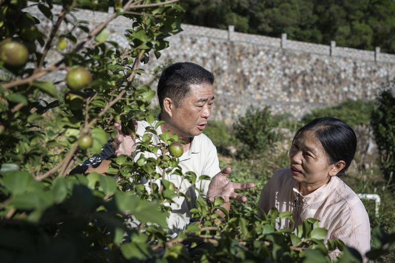 平潭综合实验区绿康农业专业合作社负责人吴正中(左)在基地查看山茶树生长情况。通讯员 念望舒 摄