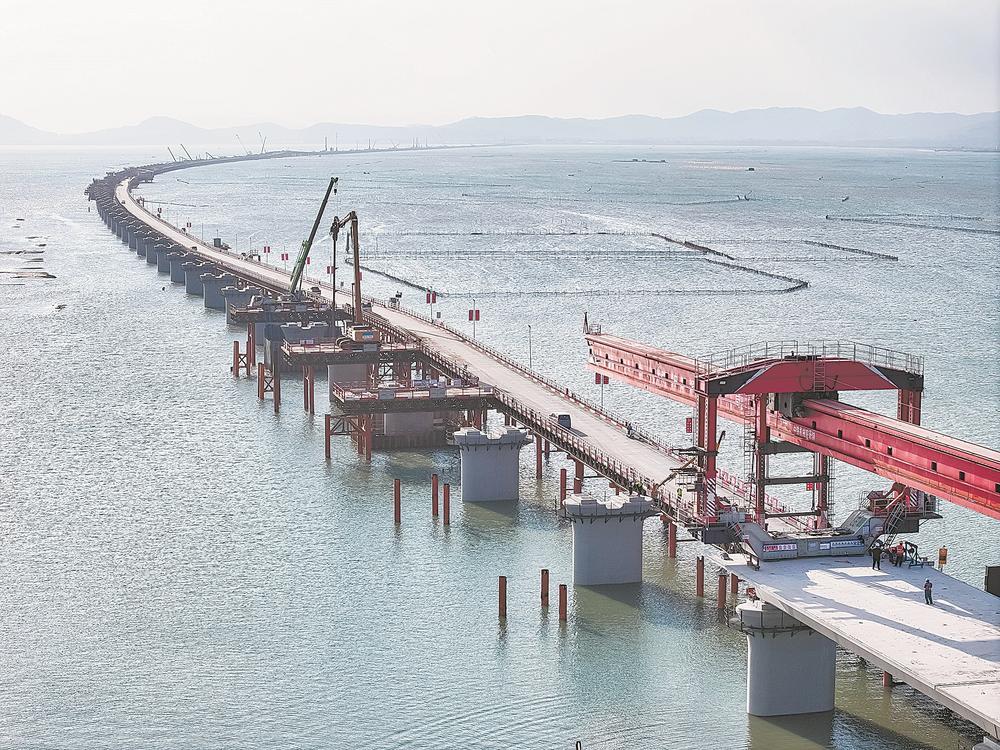 12月24日,东山县诏安湾海域,随着架梁机将一榀数百吨的箱梁平稳、精准架设到东山跨海特大桥桥墩上,漳汕高铁正式进入海上架梁施工阶段。东山跨海特大桥全长20.262公里,是漳汕高铁重点控制性工程之一。郝春娥 摄