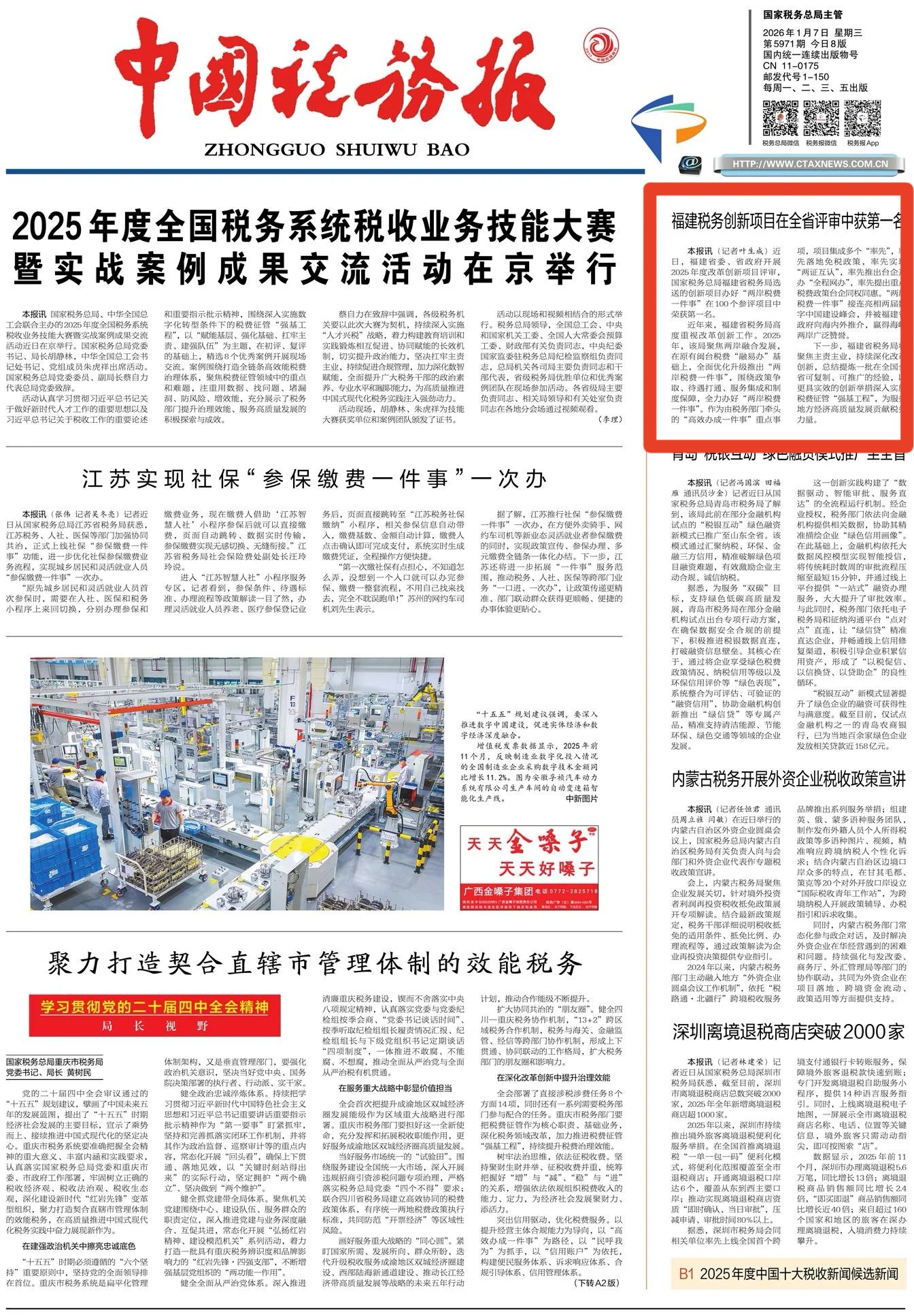 本报讯(记者叶生成)近日,福建省委、省政府开展2025年度改革创新项目评审,国家税务总局福建省税务局选送的创新项目办好“两岸税费一件事”在100个参评项目中荣获第一名。