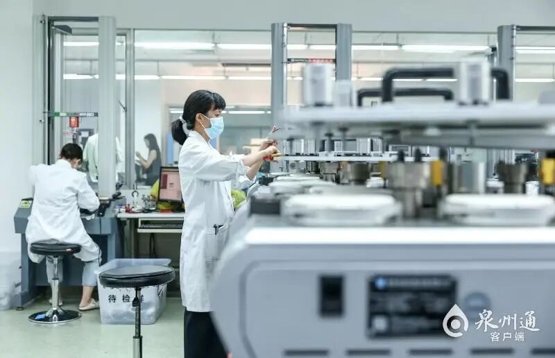 安踏实验室内,研发人员正在对样品进行测试实验。