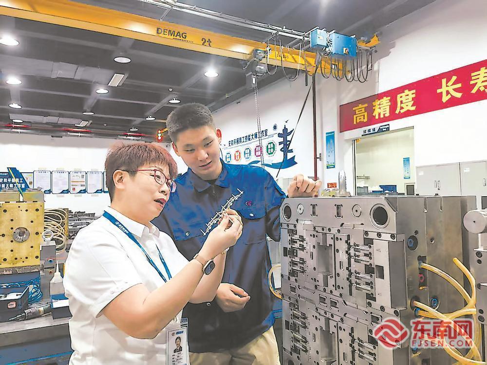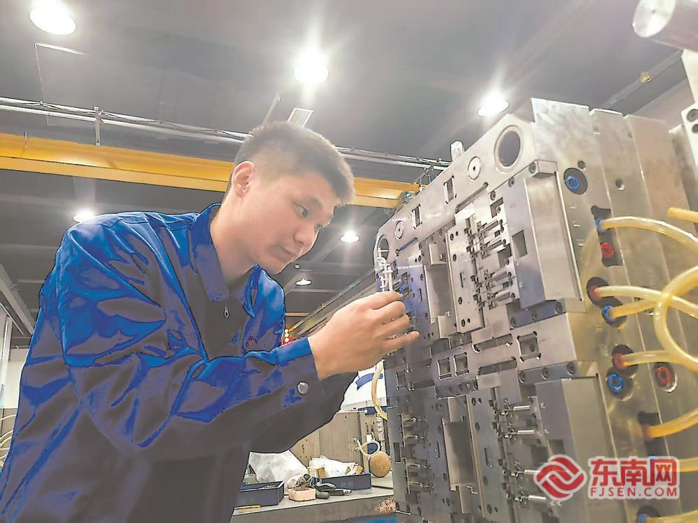 在宏发电声车间,厦门技师学院“精匠班”学生倪军逸正在打磨模具。福建日报记者 赵文娟 摄