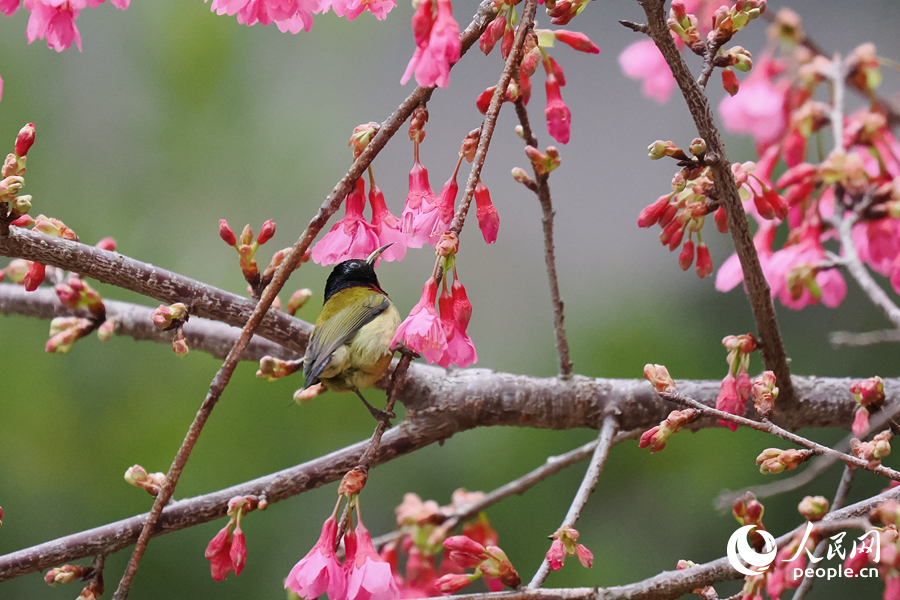 叉尾太阳鸟在樱花枝头小憩。人民网记者 陈博摄