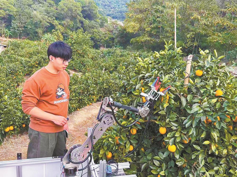 机械臂灵活摆动,精准定位每一株作物——在福清,福建农林大学的农业机器人团队在调试新一代智能作业机器人,让其采摘脐橙。“果园地形复杂,普通机器人容易打滑、定位不准。”福建农林大学机电工程学院、农林人工智能研究院教授孔祥增介绍,这款机器人采用模块化设计,搭载自主导航系统,能在泥泞、陡坡等恶劣环境中稳定作业。
